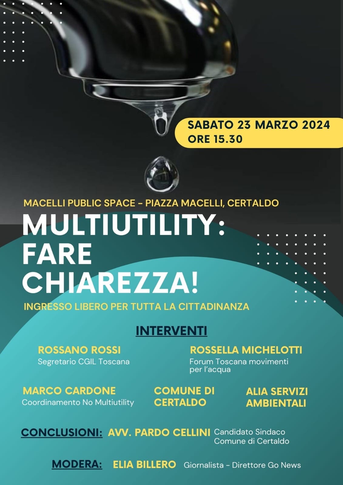 Sabato 23 marzo dalle 15:30 ai Macelli Public Space un incontro aperto ai cittadini per approfondire le ragioni del no alla Multiutility in compagnia di Rossella Michelotti e Marco Cardone.